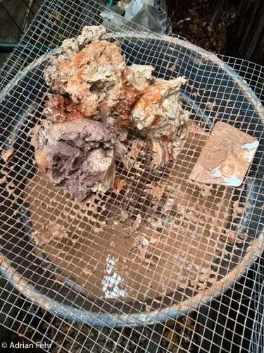 2 Shred the clay by forcing it through a 1/4” welded steel grate into a bucket of water. This ensures that everything will absorb water evenly and be mixable. Dry clay might need to be pre-moistened. The main thing is to avoid hard-to-mix lumps. I’ve also been given bags of student clay that had sponges and even tools in them!