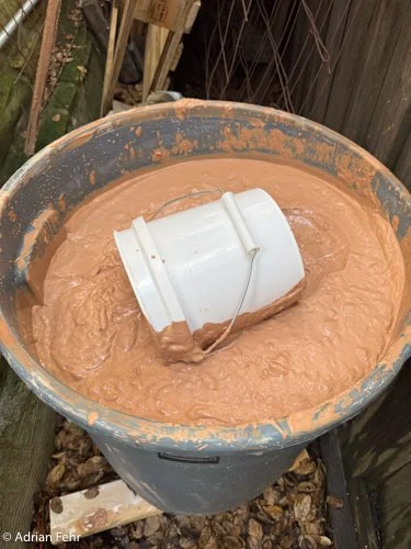 Now I collect clay in a 44 gallon plastic garbage can, shredding it when it goes in. I’m never processing more than 10-20% of the clay at a time, so the leftover creates consistency between batches. Whenever I need more clay, I just take 4-5 gallons out, and leave the rest for the future.