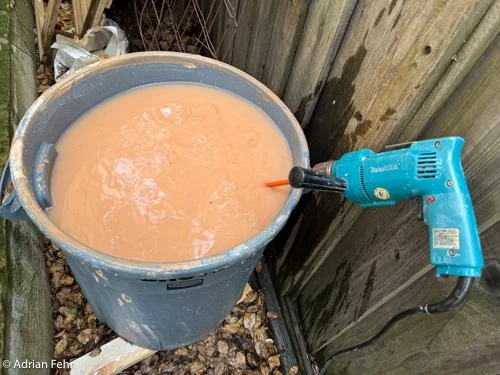 4 Mix it up thoroughly using a paint mixer attachment on a strong drill. Those little chunks of hydrated clay are still chunks of clay, and need a really strong mixing! Do this for at least 5-15 minutes until the lumps are gone and the clay is even, adding water as needed to get a pourable but thick slip. By hand doesn’t count — use a powerful drill and a paint mixer attachment.